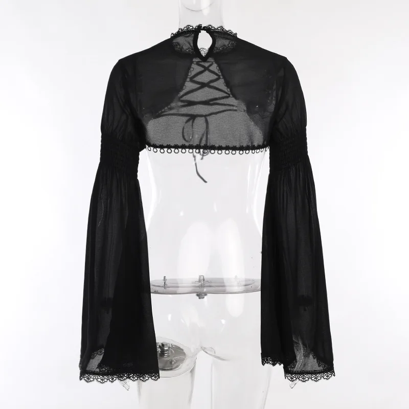 GothDark Elegant Lace up Mall Gothic Crop Shrug Tops Grunge Chiffon Flare Sleeve Blouses Female Black Emo Alternative Cover Up