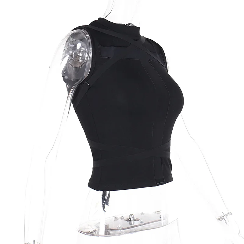 GothDark Fairy Grunge Mesh Cross Sheer Sleeveless Crop Tops Gothic Chic Bandage Tank Top Mall Basic Women Vest Alt Streetwear