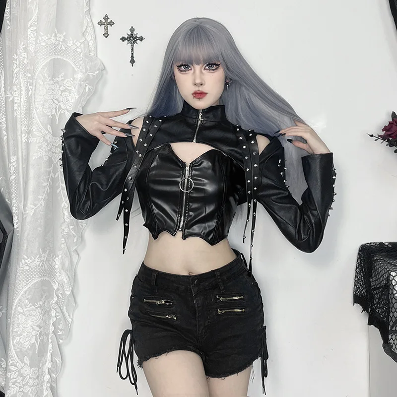 GothDark Faux Pu Leather Long Sleeve Crop Shrug Tops Grunge Women Rivet Zip Coats Chic Streetwear Jackets Mall Gothic Smock Top
