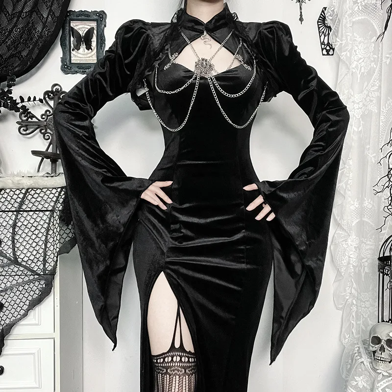 GothDark Flare Sleeve Lace up Crop Shrug Tops Elegant Velvet Chain Short Smock Coats Mall Gothic Women Slim Blouse Streetwear