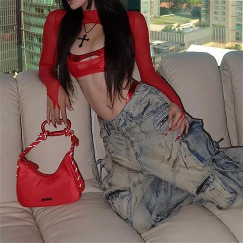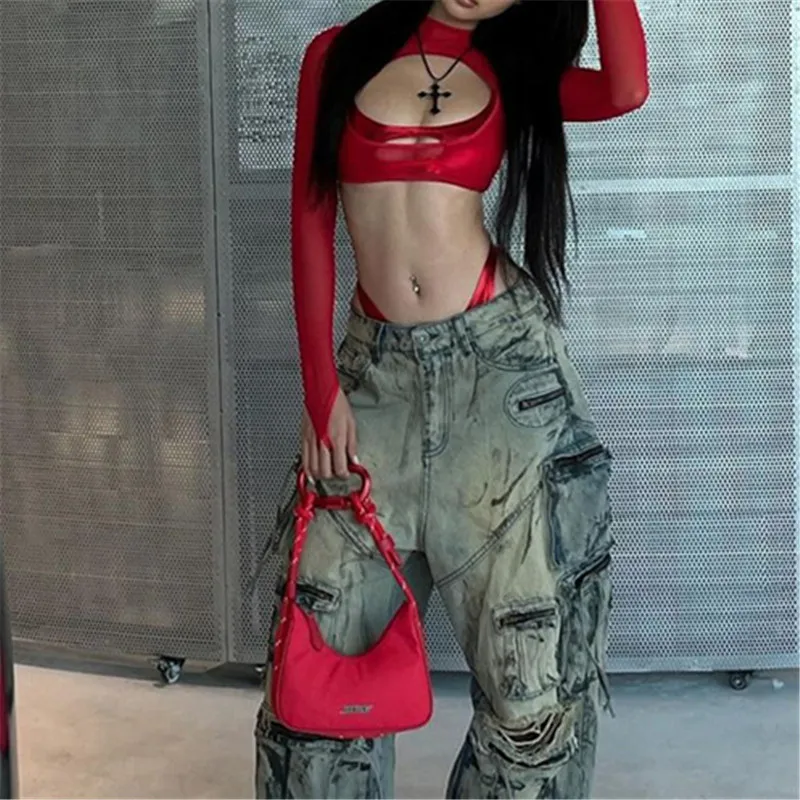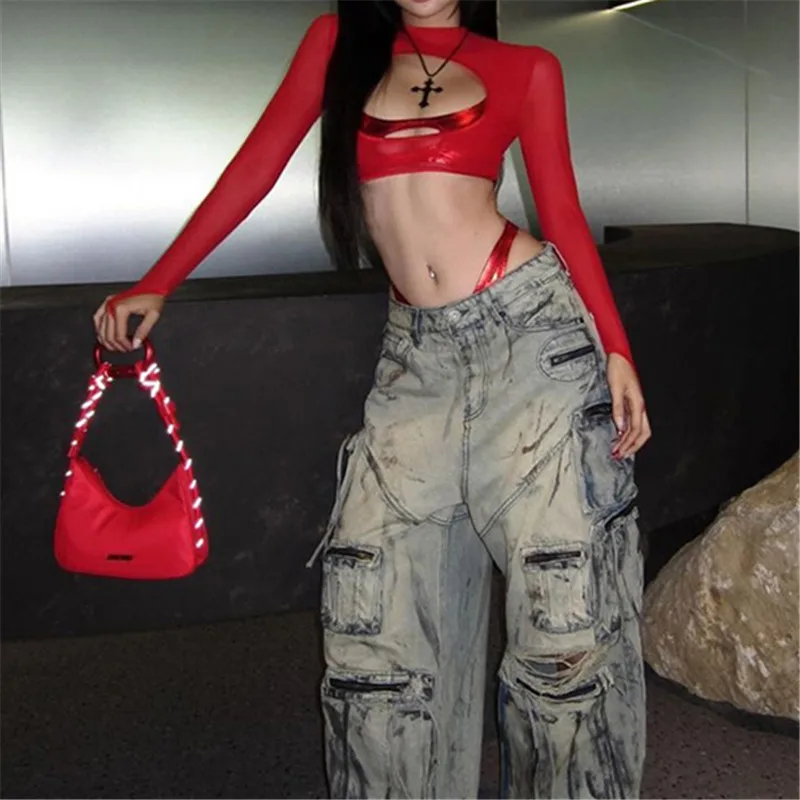 GothDark Mall Goth Cyber Y2K Rave Two Piece Sets E-Girl Cut Out Camis Sexy Hollow Out Mesh Sheer Crop Tops Women Alt Gothic Skinny Cloth