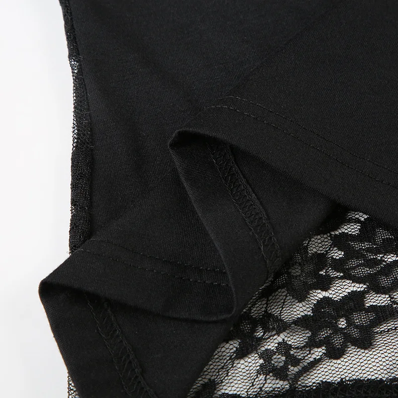 GothDark Mall Goth Solid Lace Patchwork Long Sleeve T-Shirts Cyber Y2K O-Neck Sheer Back Slim Tops Women Techwear Basic T-Shirt