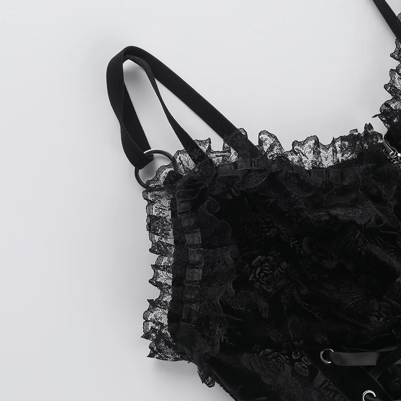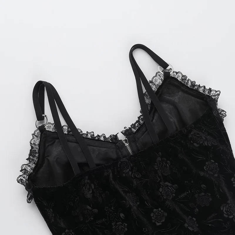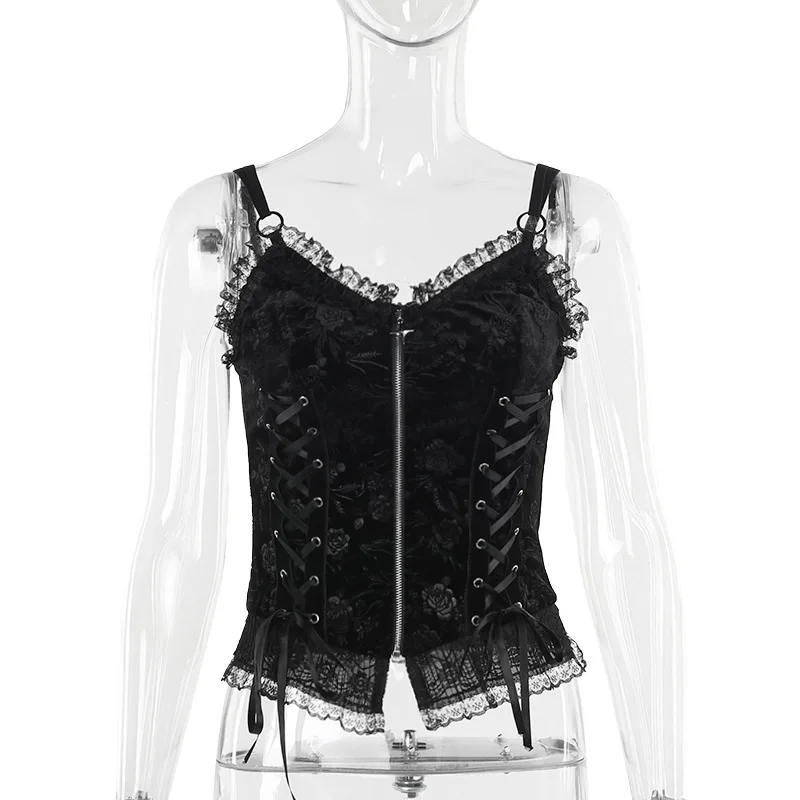 GothDark Mall Goth Spaghetti Strap Tank Top Women Cyber Y2K Fashion Lace Patchwork Jacquard Camis Sexy Bandage Crop Tops Zip