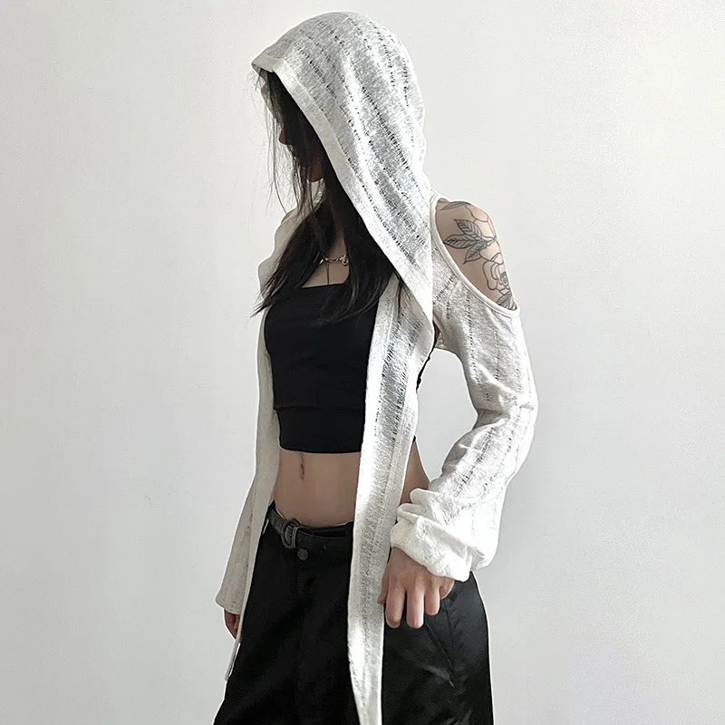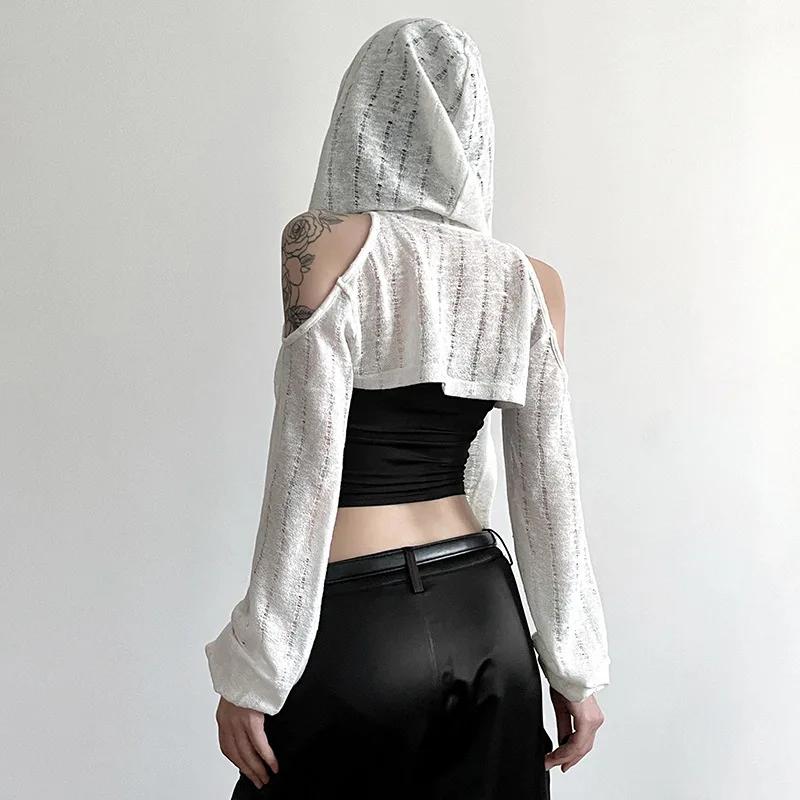 GothDark Open Shoulder Techwear Y2K Crop Cardigans Mall Gothic Hooded Sexy Women Crop Tops Punk Grunge Buckle Streetwear Shirts